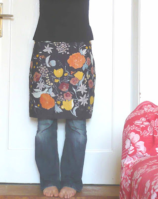 Aus einem anderen sehr kleinen zarten Rest habe ich mir einen Rock-über-Hose- mini- Rock mit elastischem breiten Reinschlüpfbund aus einem alten Kleidungsstück gemacht, womit ich aber dann doch nicht so glücklich war. Es beult am Bauch, unterm Bund was natürlich unschön ist, und einen ständig daran rumzuppeln läßt. Tja, da wollte ich faul und fix ohne RV nähen, und nachher ärgert man sich.
